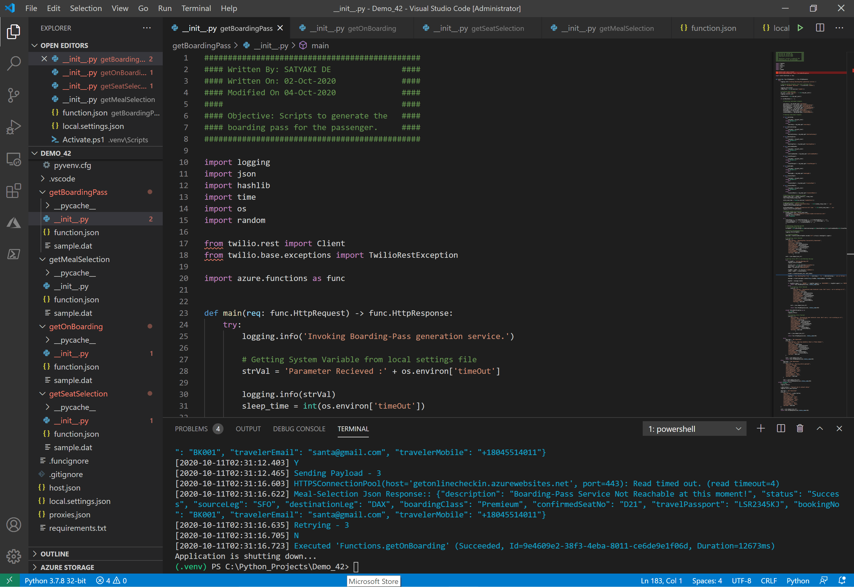 We have used Visual studio code editor for this entire development of azure functions. And, the screen should look something like this –